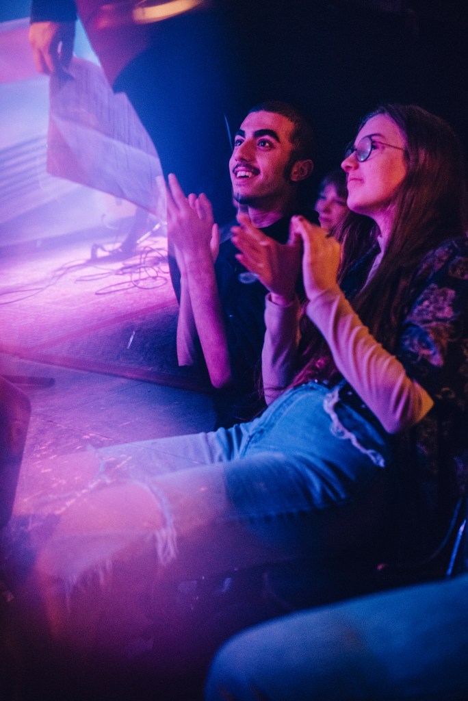 C’est dans l’obscure et mythique Petite Boîte Noire de Sherbrooke que quatre des neuf membres du COLLECTIF135 ont eu la chance de capter des artistes dans toute leur splendeur, leur couleur et leur profondeur. Au menu : poésie, littérature, danse, beat box, cocktail dessert, rap, keyboard, drum, guitare, boule disco… En résumé, une potion magique de fantaisies visuelle et auditive et une panoplie de spectateurs tous ouïe et assoifés d’éclats.